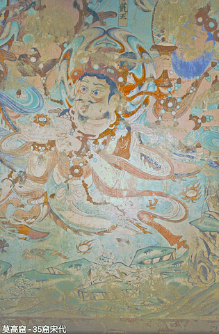莫高窟各窟均是洞窟建筑、彩塑、壁画三位一体的综合性艺术。飞天只是敦煌壁画上的一种重要艺术形式,后演变成莫高窟的艺术名片,但壁画上的飞天真的不美,只是后来人将其美化了。想起了含笑的唱的《飞天》如果沧海枯了,还有一滴泪,那也是为你空等的,一千个轮回,蓦然回首中,斩不断的牵牵绊绊,你所有的骄傲,只能在画里飞,大漠的落日下 ,那吹箫的人是谁,任岁月剥去红妆 ,无奈伤痕累累,荒凉的古堡中, 谁在反弹着琵琶,只等我来去匆匆,今生的相会,烟花烟花满天飞,你为谁妩媚,不过是醉眼看花花也醉 ,流沙流沙满天飞,谁为你憔悴 ,不过是缘来缘去缘如水。