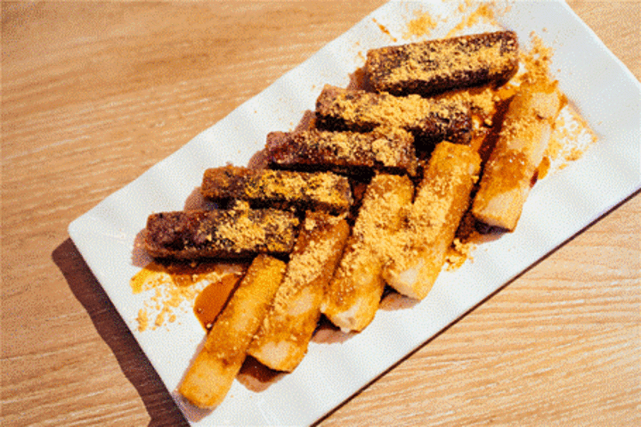甜点吃的红糖糍粑,两种米做的糍粑,黑白双煞,我更喜欢吃黑米的,感觉不会那么腻,黑米的清香和红糖的浓郁把握的非常巧妙,两人不争不抢,异常和谐,配上黄豆粉的香气,好治愈的甜蜜口感。