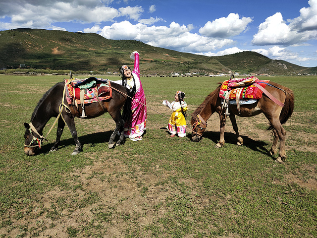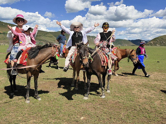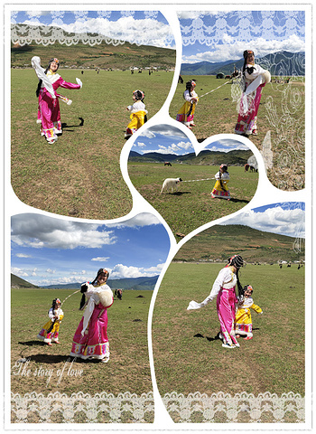 骑马我们选得是B线路,160元一人马上行程一个半小时,到达景点拍照时间随我们心情而定。租藏族服饰和小羊羔拍照共40元。小羊羔挺可爱,开始让小糯米去抱,她不敢。过了没多久她就牵着到处跑,可小羊羔不听使唤:经常不是停下来喝水吃草就是跟她往相反方向跑与她成对抗之势。我们在草原上边唱边跳放飞自我,玩得不亦乐乎。