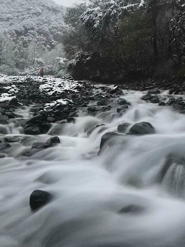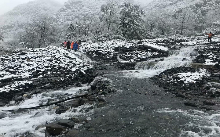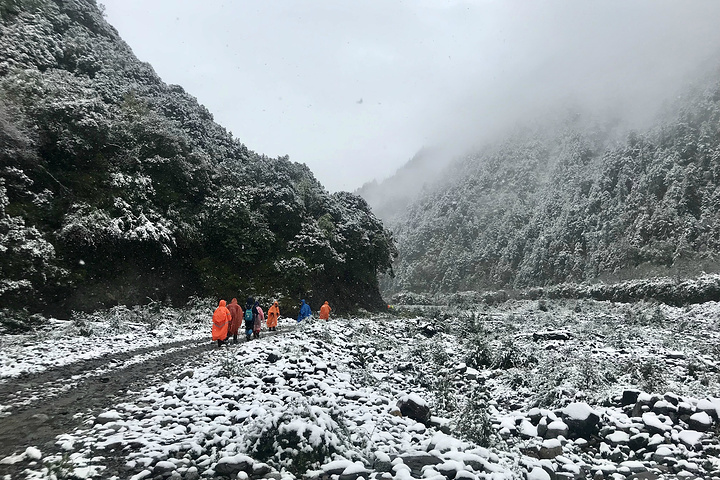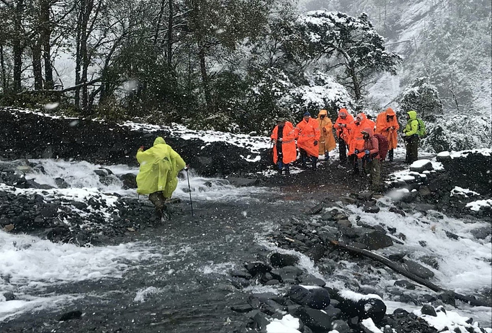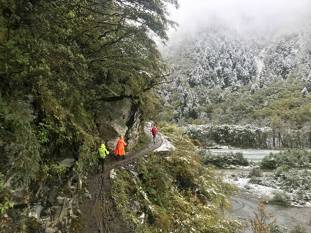 雪伴随着雨滴越下越大,有时大到打在脸上睁不开眼,丝毫没有要停的意思。山谷里静得除了旁边流水的声音,还可以听到雨雪打在树叶上的沙沙声。大家虽然走得辛苦,但却都很享受。