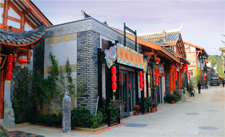 第四天我们从黄果树瀑布到了双龙镇,开车花了2个小时左右,双龙镇位于贵阳市南明区龙洞堡与黔南州龙里县的交界处,因而得名“双龙”,我们在双龙古镇里面逛了一下,我们当时去的比较早,镇上都没有多少人。古街道一旁是个小小的游乐场,另一旁是古建筑,经营有特色菜、民族手工艺品,我们在街道这里一间牛肉店里吃干锅牛肉,乘着上菜的空档,索性去逛了一圈。古镇不大,10多分钟就逛完了,但是发现了两家比较有特色的咖啡店,在入口处一小湖边,冲动的要入坐,聆听喷水声,细品一盏茶,坐上一两个小时都不觉得多。