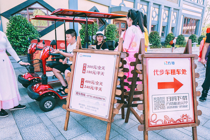 A、步车租赁tips:园区有代步车租赁,不想走路的可以选择租代步车~双人座代步车:300元/天,180元半天三人座代步车:400元/天,240元半天B、童车租赁tips:园区有4处童车租赁点,15元/小时,支持扫码支付,方便带娃出行。