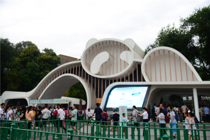 一座白色流线型熊猫形象的入口前排满了人,这里便是大名鼎鼎的“成都大熊猫繁育研究基地”了。