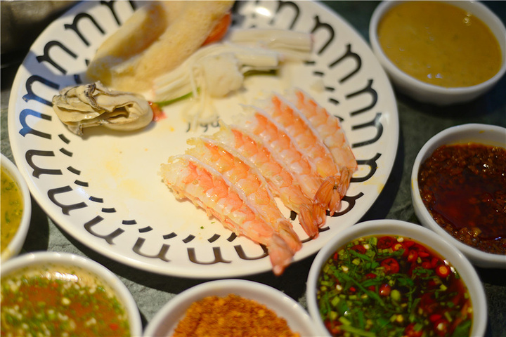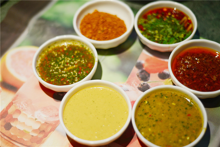 蘸碟有6种不同口味:招牌柠檬薄荷、经典传统泰式、 秘制川香小米辣、香辣海鲜、鲜香椒麻、浓香花生酱……每一种都各具特色。