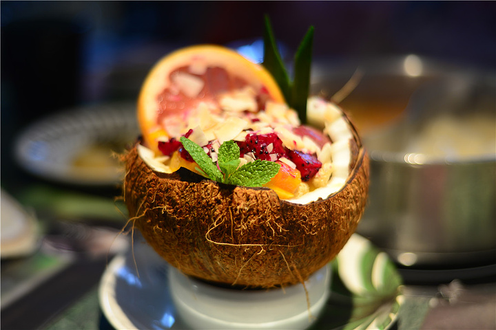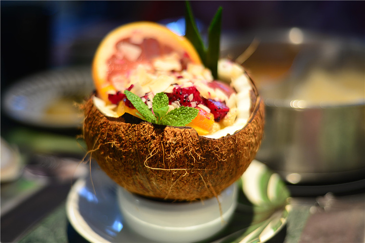 网红椰子碗必须点一份,不但颜值爆表,就连味道也是无可挑剔。新鲜多汁的芒果果粒,底下还铺了满满一层芒果冰沙,配冬阴功火锅简直绝了~