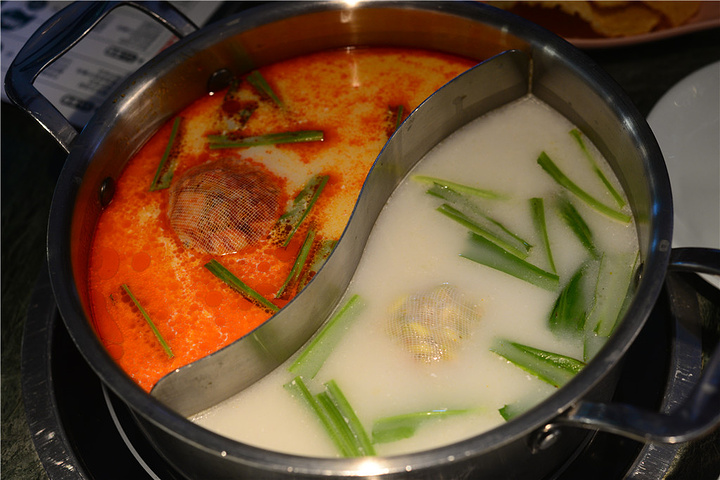 一半是招牌冬阴功锅底,上桌是一锅慢炖鲫鱼汤,雪白浓稠富含满满胶原蛋白,服务员会娴熟地依次加入泰国香菜、特调料包和秘制冬阴功底料,超强仪式感给你不一样的火锅体验。最后加入现开椰汁,鲜味瞬间被调动,还增添了清甜椰香味,一锅网红泰式冬阴功锅底就新鲜出炉啦。酸、辣、鲜、咸、甜,多重口味交织融合得浑然一体,北回归线以南的热带风情,就在你的味蕾上旋转跳跃。另一半是椰香锅底,鸡汤熬制,炒鸡浓郁的鸡汤里还带了淡淡椰香~泰式风情MAX!