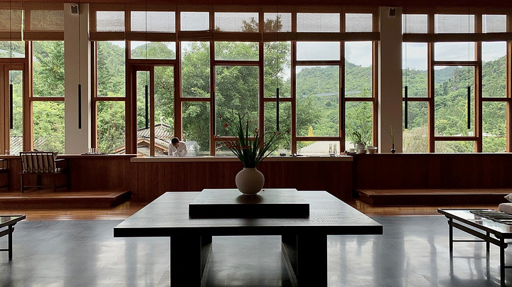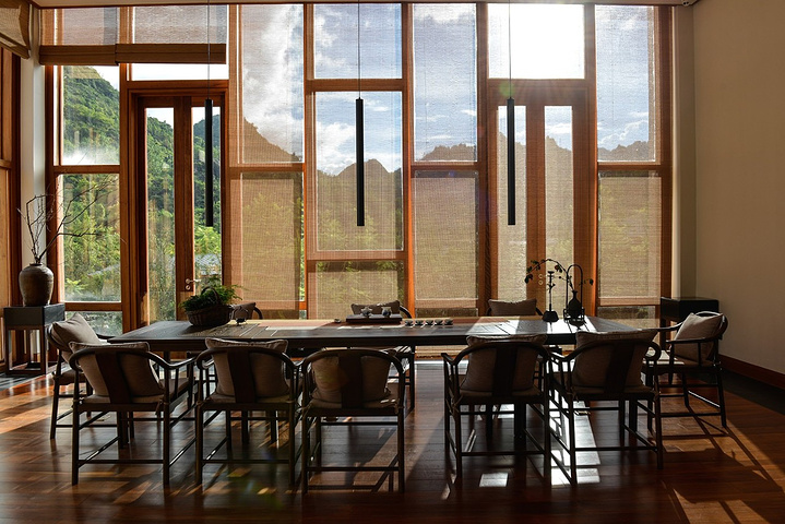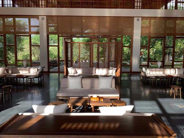 既然是新中式,设计师基于舒适感的追求,对很多元素进行了调整,尤其是采光上,黄果树柏联酒店大堂采用了大片巨幅落地玻璃,这使得凝炼唯美的中国古典情韵从小情小调变得大气温暖。