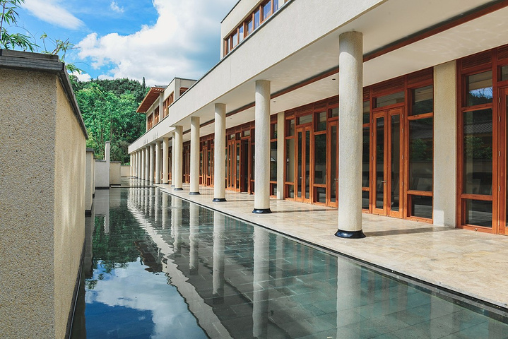 简化的斗拱,少了穿咬的繁复;负一楼回廊深深,照壁也是简洁得令人振奋,倒影水中,画面就活泛起来。