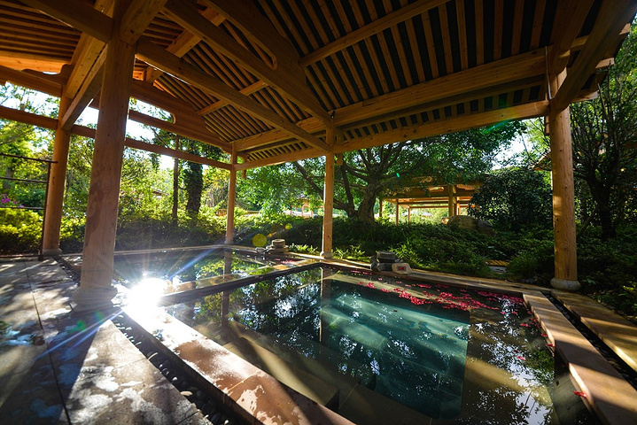 温泉区在园林里。群山环抱中,围绕着喀斯特地貌形成的的三叠碧水,结合贵州历史文化、地貌特征及黄果树景区山水自然风貌,同时沿袭柏联写意的淡泊隐逸之风,26个各有特色、取自1800米的地下天然温泉泡池,随坡就势地分布于山谷花丛中。