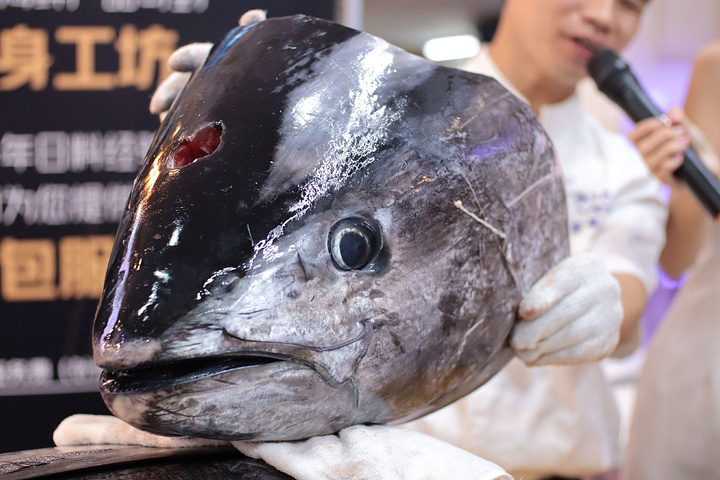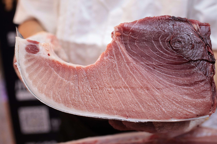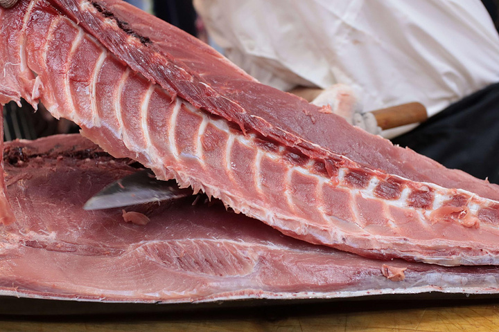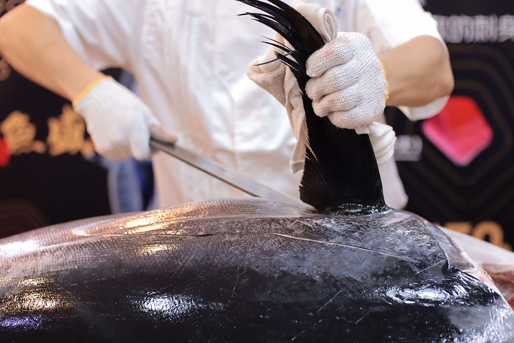 蓝鳍金枪鱼并不是什么部位都能吃的,师傅首先切除鱼的头部与尾部,您可千万别小看这一过程,切金枪鱼的头并不是一件简单的工作,因为它头部的骨头非常坚硬,用蛮力硬切是行不通的。师傅会找到鱼头和鱼身的衔接处,然后快刀斩乱麻才能成功将其切开。