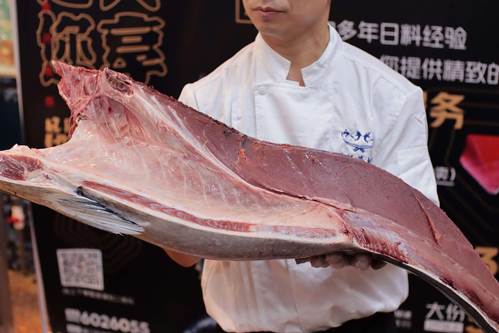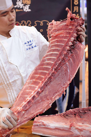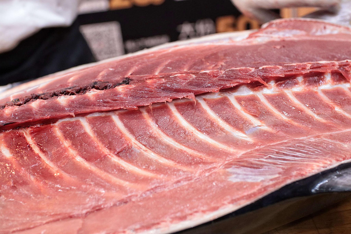 整条鱼身上最贵的地方来了哦,大腹是整个蓝鳍金枪鱼身上最稀少、肉质最肥嫩的部分,肉质细嫩呈粉红色并且入口即化,鱼肉有明显脂肪纹路和油脂香。