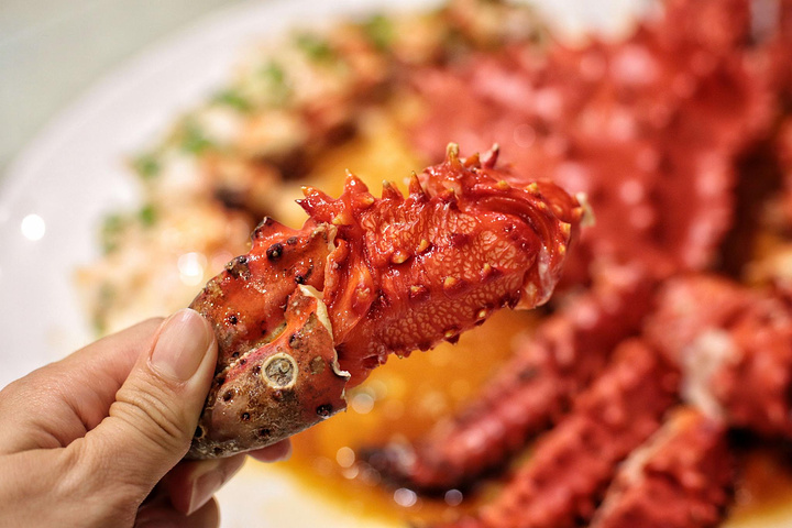 新到的皇后蟹一来就端上我们桌咯,硕大的蟹腿轻轻掰开,鲜味都闻得到,尝一口,鲜甜!