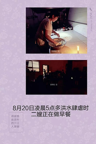 整整20个小时的洪水历险,在自然灾害突然大难临头之际,几百户的三江人,默默地承受着三万多游客的生命安全,有序组织、毫无怨言、一心为了游客,付出他们的全部精力,哪怕是有病在身也没有丝毫退缩……