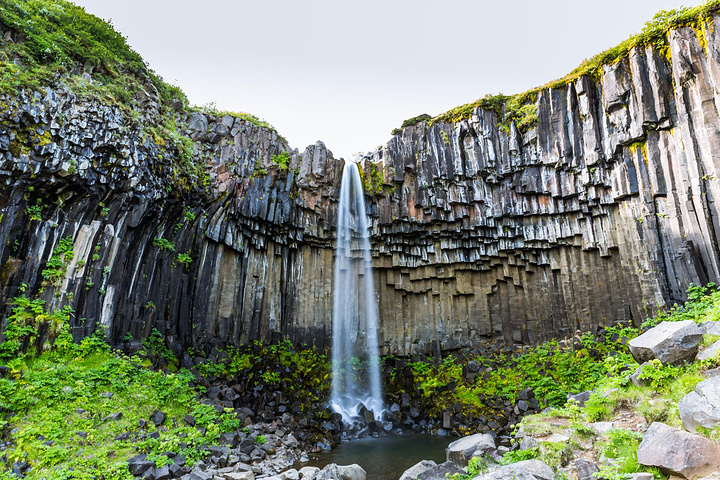 Svartifoss,在冰岛语中意为黑色的瀑布,由于周围环绕的黑色玄武岩而得名。这些六边形棱柱是熔岩流慢慢冷却结晶形成。斯瓦提瀑布不在公路边,而是位于瓦特纳国家公园内,需要沿着国家公园内的S2徒步路线步行1.4公里才能到达,且需要爬好几段陡坡,因此这里的游客不如其他南部景点那般众多。瀑布有两个观景地点,一个位于稍远的桥上,另一个位于更近处的观景台