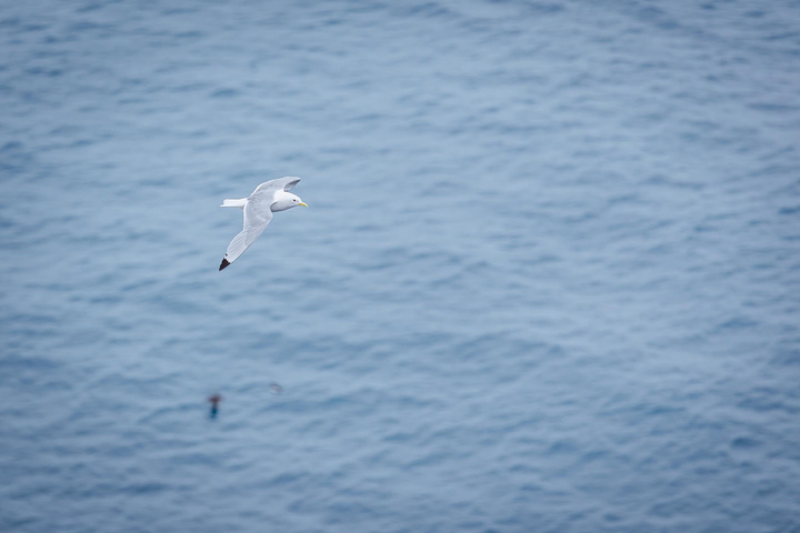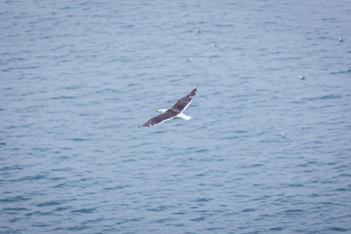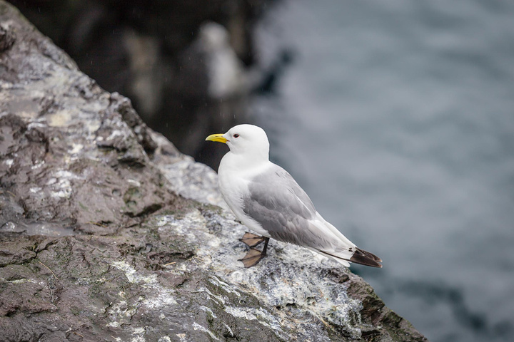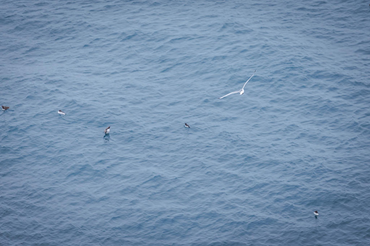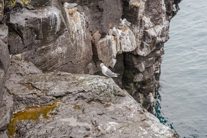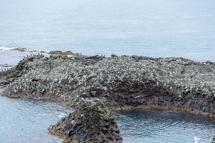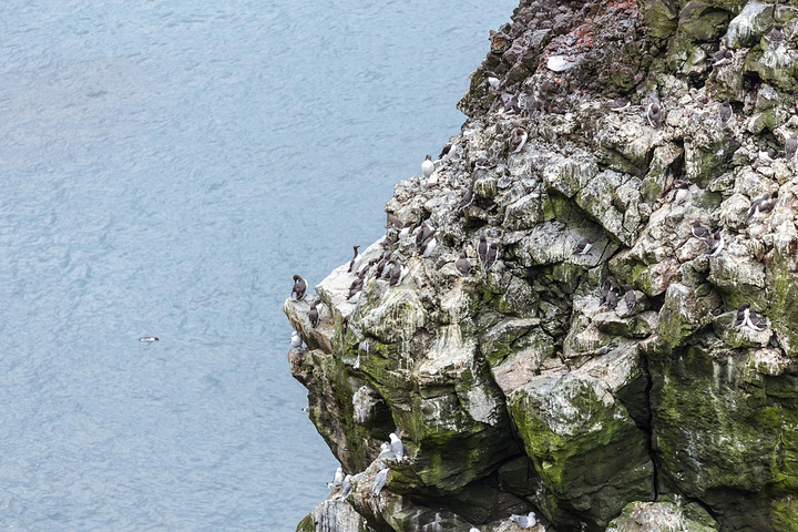 狂风呼啸声中,分明能够听见鸟儿们的叽喳歌唱,海湾峭壁上,乍一看都是黑白色,仔细看,竟然有一团一团的鸟群停留在此。黑色的岩石,被众多的鸟粪覆盖,几近白色。因此也使同是黑白色系的鸟儿更加隐蔽。但鸟叫声分明昭示着它们的存在。它们停留在岩石上,梳理毛发,喂养幼儿,或从远处衔着食物飞回来,或在石头边盘旋玩耍。自然的和谐让人身心愉悦