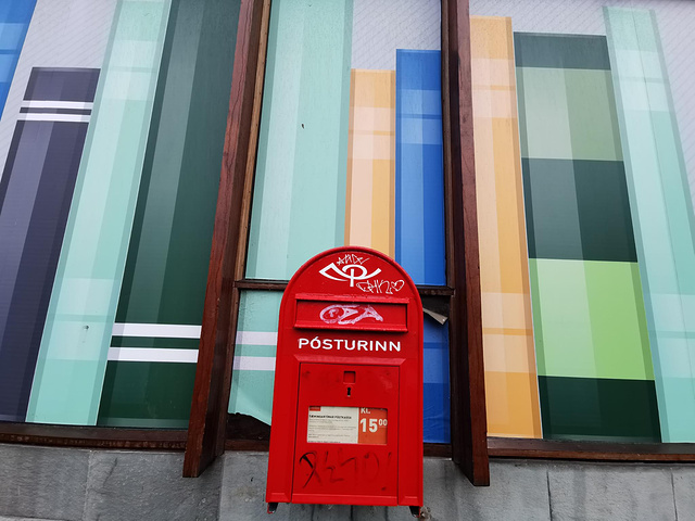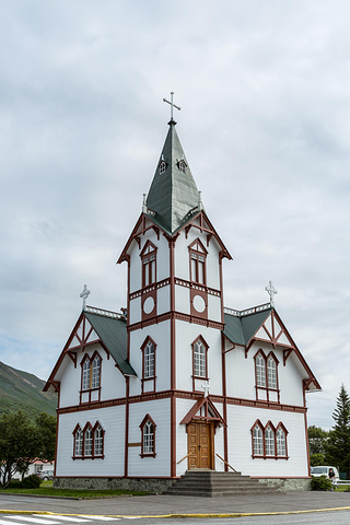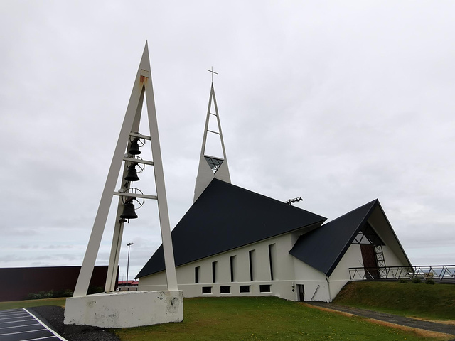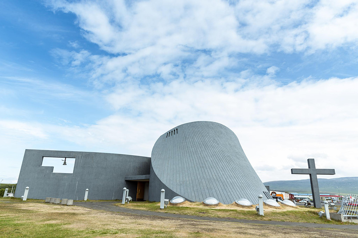 后现代设计风格的布伦迪欧斯教堂,虽然颜色低调,但风格却非常抢眼。门口竖立着一个超大的十字架,我们围着它转了好多圈,又看到开着门,我们便想进去看看,门口坐着一位老奶奶不会英文,没有阻止我们,同时指着桌子一块英文牌子请我们捐款。行程过了三分之二,我们兑换的冰岛币还没花一分钱,于是拿了400冰岛克朗捐给这个遥远的教堂,老奶奶很高兴,特意起身向我们招招手,示意我们往里走观赏。实际上教堂内部很小,一眼望到边,此时也没有人,我们就在椅子上静静地坐了会,边坐着边东张西望,看看这教堂的墙和屋顶