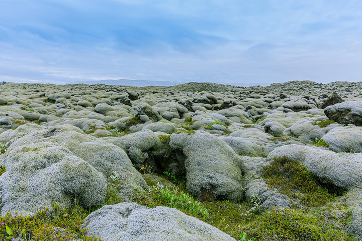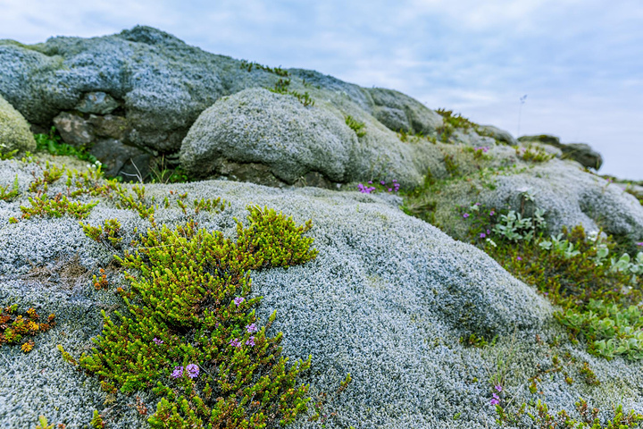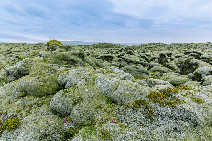 另一种最常见的植物,便是苔原。冰岛这片土地长久的历史中,火山一次次爆发,灼热的火山岩浆洗刷大地,风暴过后,一切终又重归宁静,而一切也变得不同。火山灰逐渐沉睡过去,而苔藓揉揉惺忪的眼睛醒了过来。它们寂寞地生长,无声地蔓延,如绿色的绸缎逐渐滑入每个地表空隙之处,覆盖住这片灰黑的土地。它们已生长百年,苍莽蜿蜒千里,是冰岛所有能看见的绿色中最浓墨重彩的一笔。它们的厚度能达到20厘米,就像厚厚的毛毯,温柔又厚重地覆盖住地面。他们在晨雾里组成一片绿野仙踪,在阳光的照射下又似散播的黄金闪耀,乌云密布时又如一方异域魔境