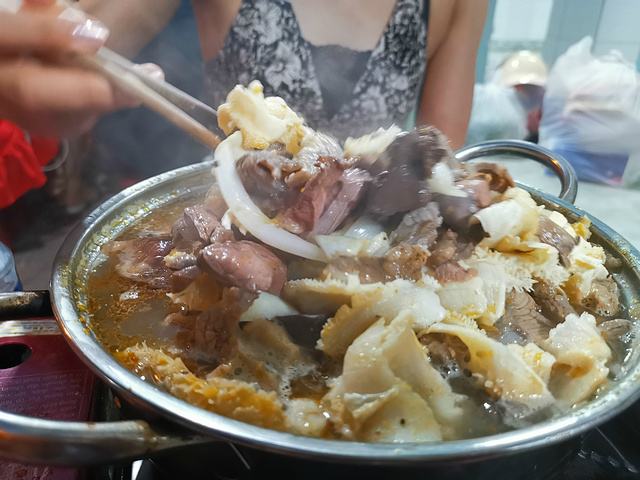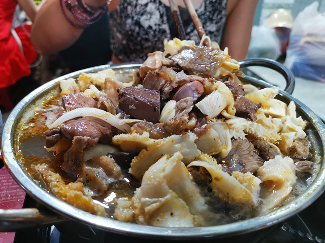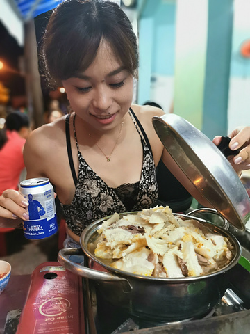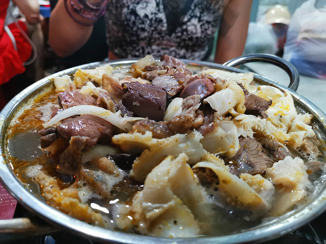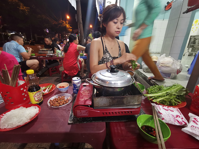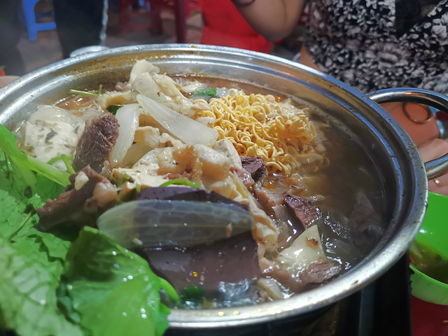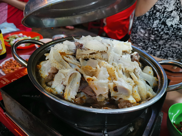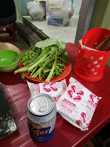 逛完超市后,我们赶紧出去觅食,今天晚上打算吃点不一样的,听说芽庄比较流行牛杂火锅,正好我又好这口,吃个火锅也更符合我们的胃,正好看大众点评,离我们酒店不远有一家人气很旺的牛杂店,店的名字是MY HANH,在大众点评的名字就叫牛杂火锅,地址是22 Nguyen Chanh, Loc Tho。我们到了之后,发现这是一家非常接地气的小店,来这吃饭的基本上都是本地人,小店没有菜单,直接就是一套牛杂火锅,包含一份满满当当的牛杂锅,一份米粉,两份泡面,一碟花生米,一份蔬菜,还有当地特有的香料,辣椒还有蘸水。价格不贵,一套相当于人民币100元左右,酒水饮料单点,也不贵,两个人一锅妥妥能吃到撑,什么也不用加,牛杂锅里配料也是相当足,这一顿吃的相当满意,推荐大家来吃。