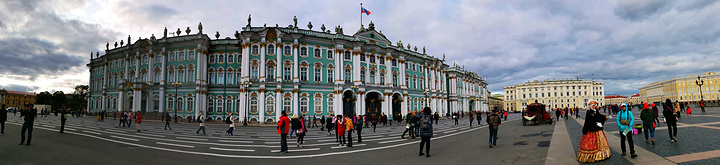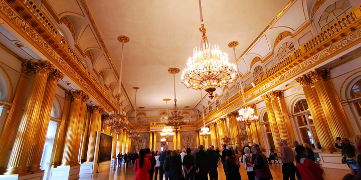 走进冬宫,满眼皆是高耸、巨大,无论是穹顶还是廊柱,都是那样饱满,仿佛不是人类建造的,似乎像大地、天空一样早已存在,让你觉得它能万年不败。每一个大厅里面,墙壁上都悬挂着世界名画。达·芬奇、拉斐尔、毕加索的巨型原作,不可思议地呈现在眼前,让你总是无法相信这是真实的。