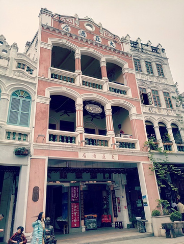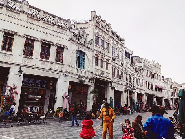 以前这里很多楼都是危楼,目前骑楼正在分阶段改造,翻新改造,据我观察此种翻新工程只是一个表面功夫,把对街道的一块进行完整的包装,而在这些街道的背部依然落败。大修过的骑楼,初看会比较经典,当你走完所有的点,又察觉不到一些闪光点,美丽而大气的房屋却少了一些灵性,或许是在整体翻修的时候用了颜色过于鲜艳的涂料,为什么不能按照古房子的模式改造。个人觉得 中国 某些方面还真该学学别的国家,改造的不伦不类就是毁了老祖宗的文化。