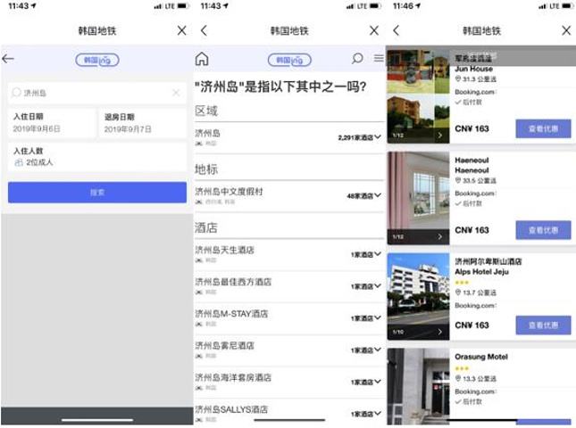 进入主界面以后,在人气地区的功能界面里有一个酒店的索引标志,点进去后按那个放大镜的小图标,搜索目的地酒店。酒店覆盖率非常非常多,这里有两千2291就是一家济州岛的酒店有在这里注册,可选择余地非常非常大: