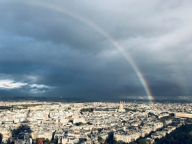 正巧赶上埃菲尔铁塔130周年,在铁塔的旁边设立了一个小型的展览,介绍了铁塔的各种历史和知识。因为下雨,游客只能到中间的观光台,这个高度已经足够俯瞰 巴黎 ,刚登上铁塔的时候雨很冷,风很大,冻的我们完全不能管理自己的表情,忽然雨就停了,风还是很大,从无数个房顶之间伸出了一道彩虹,夕阳就这样洒下了金光,让人看得发了呆,发了痴。在旅行途中看到彩虹, 京都 是第一次, 巴黎 是第二次,每一次都在狂风和急雨后。