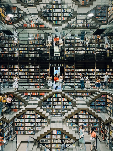一进门就有很多圆锥形的书架,错落有致,天花板是镜面的,视觉感受强烈,穿梭其中有一种盗梦空间的感觉。