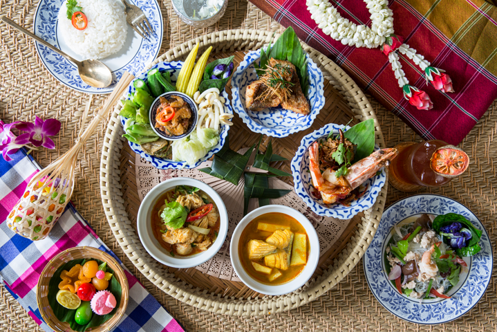 中部菜特色套餐由海鲜冬阴功、红咖喱烤鸭、虾/鸡凉拌炸空心菜、香兰叶包鸡、炸虾球和又嫩又香的当地米饭组成。南部菜则包括咖喱蟹、酸角酱炸虾、椰笋酸辣鱼汤、辣酱炒虾、香茅炸鱼和米饭。