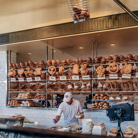 尽管有朋友告诉我,不要去渔人码头BOUDIN酸面包工厂。但是路过这里,我还是忍不住进去为此买单,Boudin的面包被誉为是“ 旧金山 餐饮的精华之作”,Boudin圆黑小面包、新鲜蟹肉、低温白葡萄酒搭配起来,就是 旧金山 最典型的一餐。络绎不绝的客人,形状各异的大面包,螃蟹,爱心,小熊让 泰山 惊呼起来。