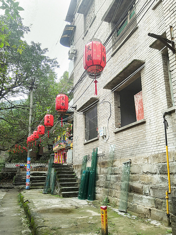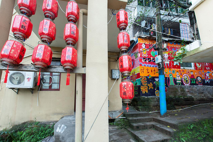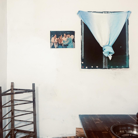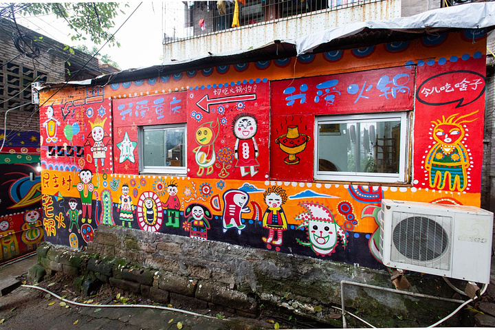 顺着青石板铺的梯子上去就到了,墙面上的涂鸦让人觉得这里更像是个文艺青年打卡地!顺着小巷子走进去里面更是一整栋房子都是涂鸦,相当有个性!餐厅里的布置也是复古,八仙桌、竹制的置物架,还有挂了很多七八十年代的港星照片。