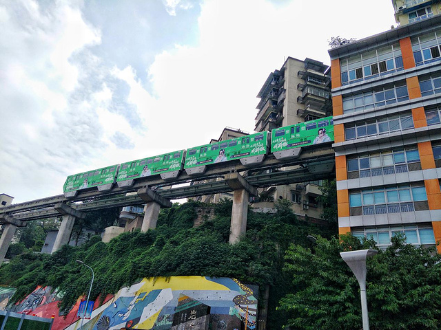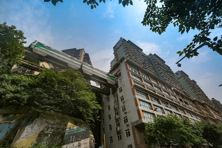 虽然不是节假日,但人也不算少!在这里真的能看到轻轨穿楼的各种玩法!搂着,捧着,托着……什么样的都有!来这儿除了看轻轨穿楼,感觉看游客的花式玩轻轨更有意思!