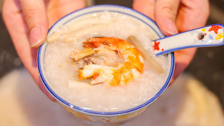 海鲜在蒸汽锅上蒸,锅底下是一锅粥,新鲜的海鲜汁从蒸锅溢到锅里,这份如同火锅一样煮出来的海鲜粥简直是色香味俱全!