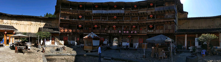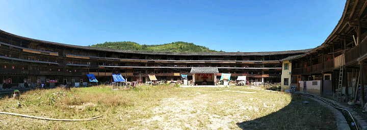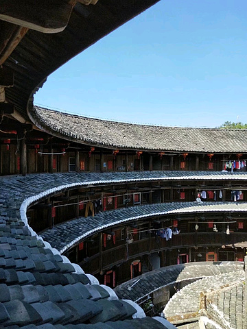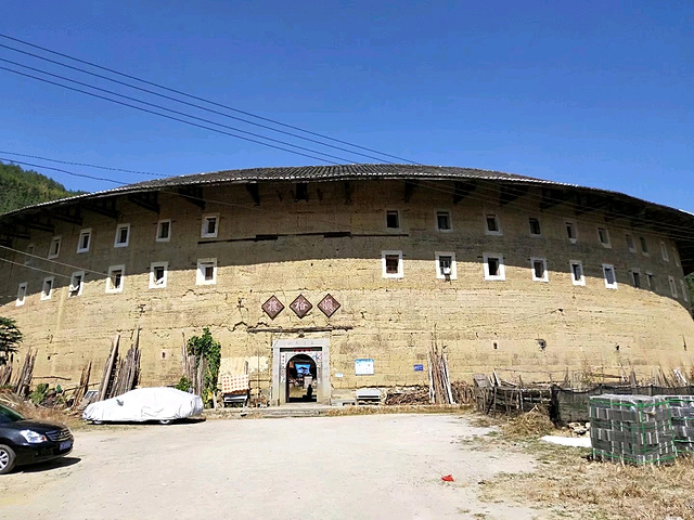裕德楼~前半楼高四层,跟一般土楼没什么不同,奇怪的是后半楼,只有三层楼那么高,却只有一堵半月形的夯墙,上面盖着护墙瓦,什么也没有了,人们形象地把它叫作“围裙楼”。据当地人说是因为土楼失火造成的,后来火🔥被扑灭后也就没有恢复到原来的样子,这也算是比较独特的土楼了。