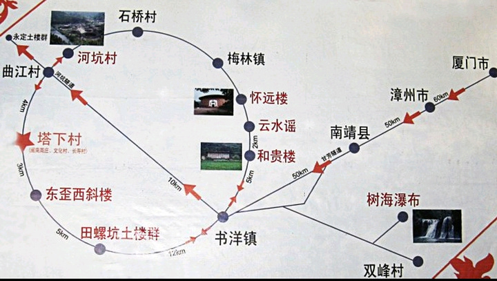 从顺裕楼出发要去塔下村,开车也要几公里,中途经过河坑土楼群,不过这个景点我们没有去,好像也要单独收费的,司机弟弟说这个土楼群基本没怎么开发,比较原生态,土楼模样嘛大同小异,所以就直奔塔下村了,塔下村属于A线景点之一,从塔下村可以去东歪西斜裕昌楼,最后到田螺坑土楼群,这样一路走过来你会发现,从和贵楼~云水谣~塔下村~东歪西斜~田螺坑刚好是一个圆圈⭕。