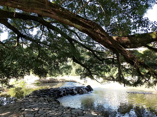 溪岸边,由13棵百年、千年老榕树组成的榕树群非常壮观,其中一棵老榕树树丫长达30多米,树干底端要10多个大人才能合抱,是一棵目前已发现的最大的榕树。