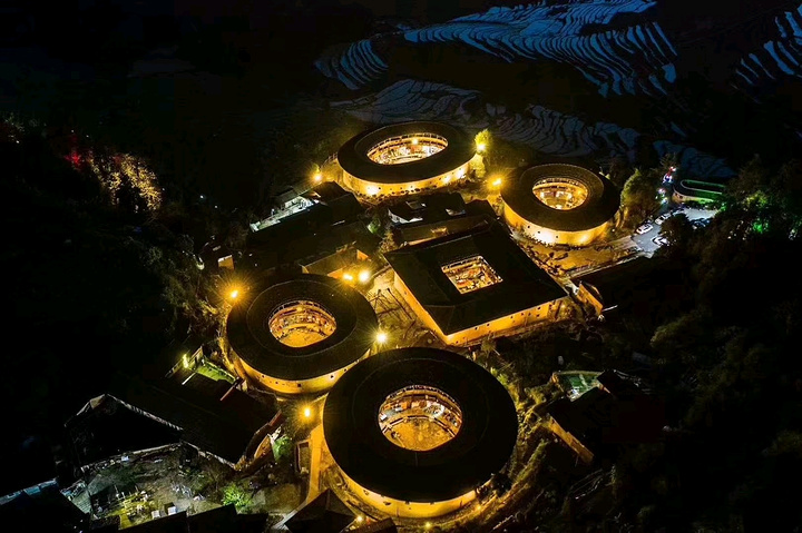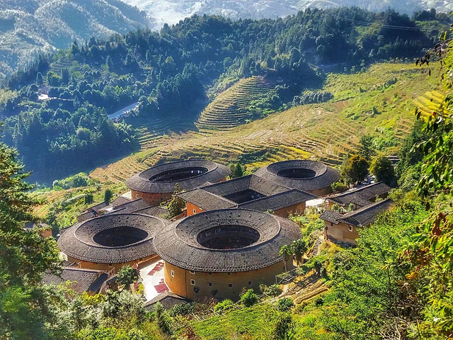 田螺坑土楼群~由5座土楼组成,其中方形步云楼和圆形的和昌楼迄今为止已经有223年了,五座土楼依山势错落布局,站在观景台上俯瞰,像是一个个的飞碟从天而降,令人叹为观止,田螺坑土楼群也被外界形象的比喻成“四菜一汤”🍲🍵