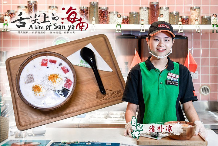 必吃理由:①海南目前清补凉最大的门店餐厅;②三亚清补凉必吃第一品牌,此外有很多分店;③环境优美,椰林海岛、渔船实木元素,颇具小清新风格,静谧又文艺,是夏季午后小憩、情侣蜜月打卡;④最具仪式感的清补凉甜品;⑤最大特点“自然椰”,选用老椰子,选取椰肉椰奶椰丝,分量足,肉饱满,口感甜;⑥地道配料,传统配方,手工调配。
