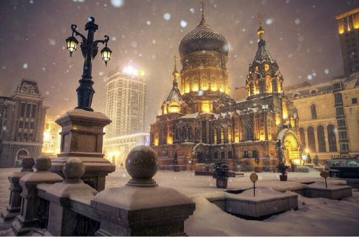 4⃣️索菲亚大教堂: 在去往中央大街的路上,我去的时候正在维护所以没有进去,要是能碰到下雪真的超级美了,绿色的屋顶铺着薄薄的白雪,很欧洲风。从中央大街到教堂步行就可以了哦 是不是恍惚间有种出了国的错觉索菲亚教堂的内饰,花15门票就可以进去看。来自游记冰雪奇缘,留下最美回忆!哈尔滨一日游攻略
