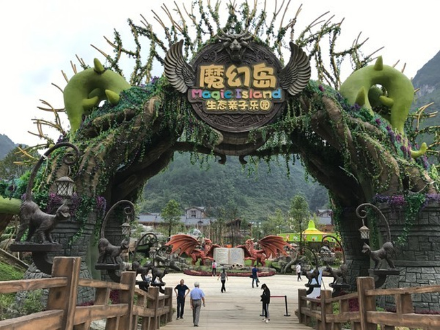 中国傩城是当今世界最大的傩文化古城,其整体布局契合金、木、水、火、土五行相生原理,融入福、禄、寿、喜、财祥瑞元素。我们先沿外圈游竹王古街、山王古街、仡佬古街,及福广场、禄广场、寿广场、喜广场、财广场;再进入湖中间的梦幻岛,这是一个梦幻生态亲子主题乐园,有怪怪木屋、淘金小镇、丛林穿越、蚂蚁城堡等游乐项目,玩得很高兴。