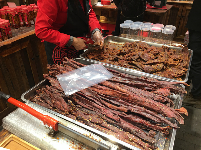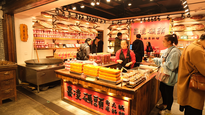 我们在“洪崖滴翠”附近一家叫“嘉陵码头”的店试吃,不知不觉地就掏钱买了特产(凑满200邮寄到家,方便) ,以辣为主,不太能吃辣的我却又“贪心”,全都试吃一遍,吃完感觉自己的嘴肿了(目前价钱:辣萝卜仔19元一筒、辣牛肉98~120元一斤、辣豆鼓,辣冬菇酱38元罐,微信注册会员后送了每人一小包花生糖)
