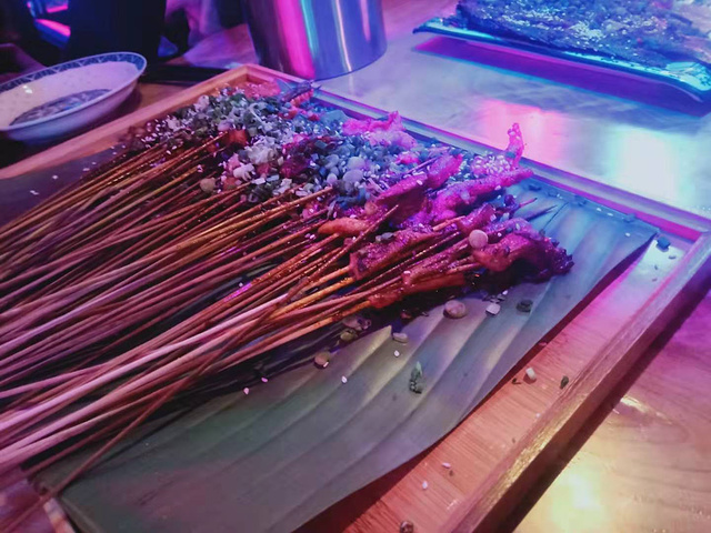 店内装饰中式元素搭配现代闪烁的霓虹灯店门口灯光烘托,看着就很有气氛,最喜欢的是顶上那个会动的五彩的泡泡灯。