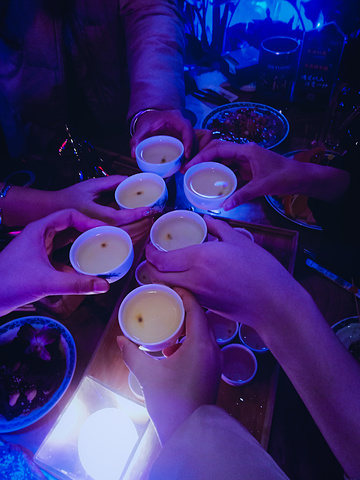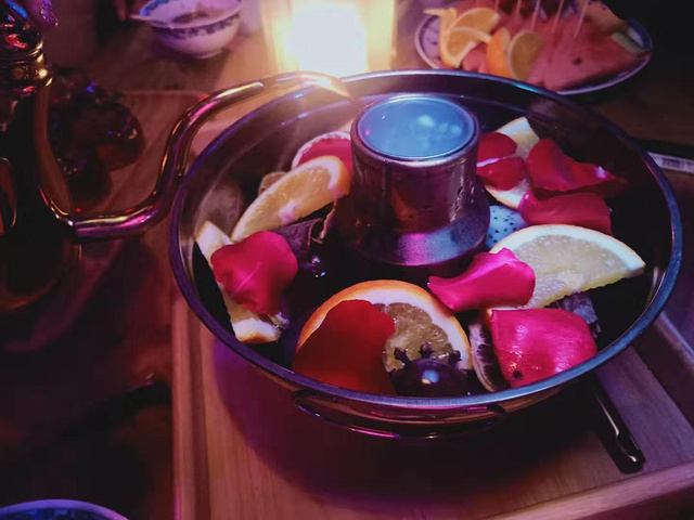 还有就是特色的火锅酒,像火锅的那样的锅,里面装的果酒,里面用料很足,橙子、火龙果、葡萄好多水果,上面还漂浮着几片玫瑰花瓣,喝起来是非常的好喝,有一股玫瑰的香味,香甜可口,喝完了还是意犹未尽啊。