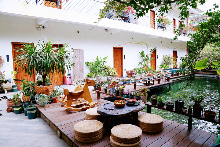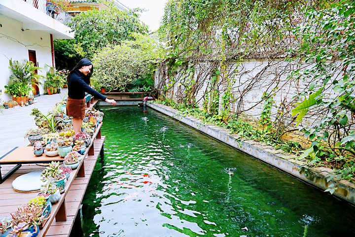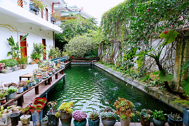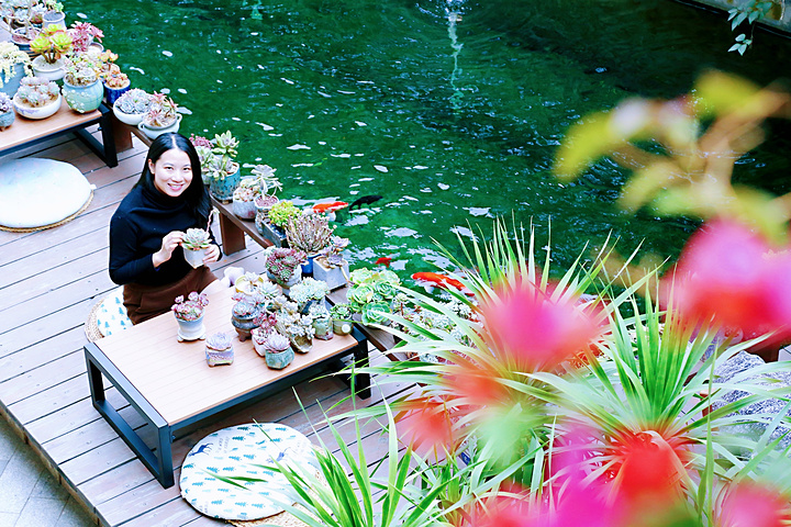 一楼院子里水池边的榻榻米,也是个品茗的好地方。环境清新雅致,逗鱼戏水,或摸摸一盆盆可爱的多肉,让人爱不释手。