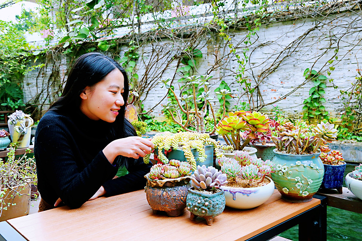 推开门,就是花园般的小院了,经过悉心照料的各式绿植花卉、盆栽多肉,真是“乱花渐欲迷人眼”,看似随意摆放,却又赏心悦目,让人觉得院子里的一景一物都是有生命的。