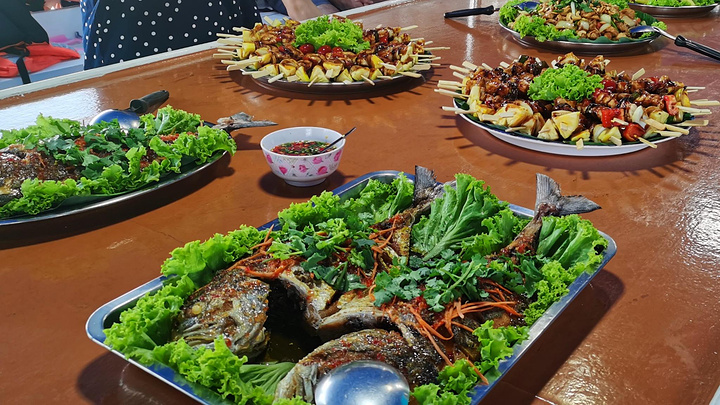 上船之后就是做水灯和享用晚餐的时间了。导游当时还特别强调了,这个活动只是作为一项旅游体验,不代表任何宗教或者习俗,让大家不必有所顾忌。不过为了保护生态,等蜡烛灭了我们需要自己把灯带回去。