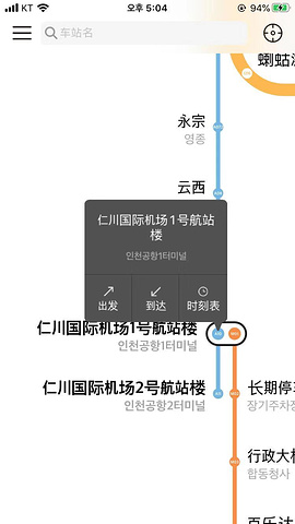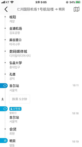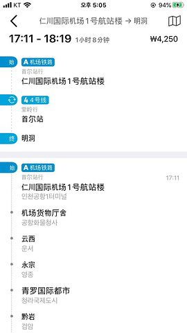 仁川国际机场1号航站楼(站) -> 明洞(站)