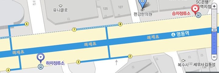 明洞站乘车点(红色标识) / 下车点(蓝色标识)位置如下:
