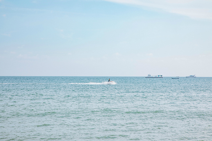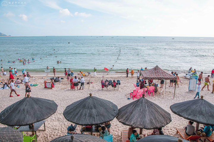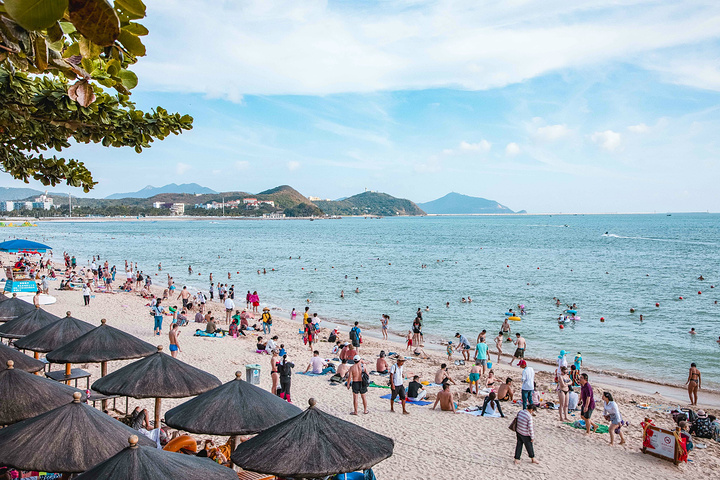 有许多游人在这里休闲,穿着泳衣披着浴袍的游客,在海滩走来走去,欢快写在他们脸上,有的坐在遮阳伞等下,一边眺望 大东海 ,任丝丝清凉的海风吹在脸上,抛却了一切压力和烦恼,海阔天空,尽情遐想,惬意极了。
