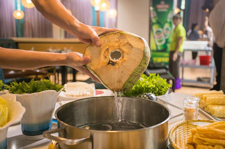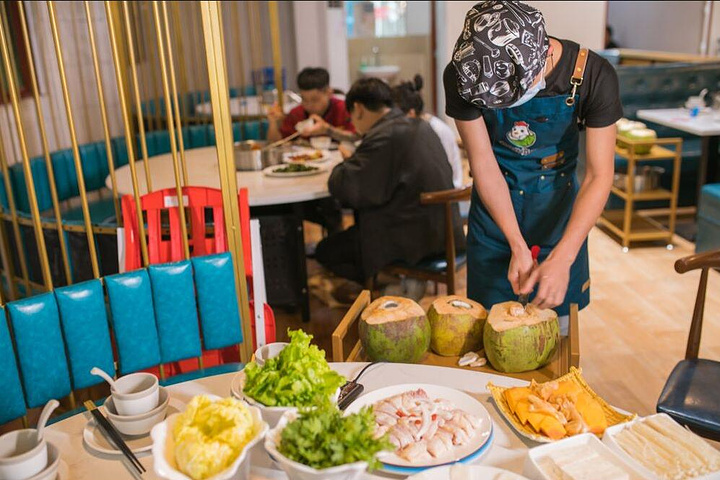 椰子鸡天然食材在锅底,开始的时候三只椰子倒锅里,就是纯天然的汤底,煮开倒进椰子鸡,先喝汤再吃鸡,最后再涮配菜这才是椰子鸡正确的打开方式。