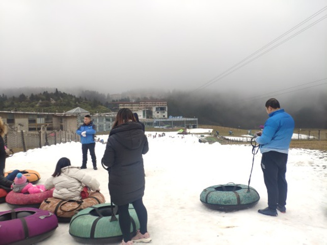 温饱问题解决后,我们行程的第一站就是仙女山滑雪场了,由于天气原因,场内的积雪没多少,所以景区内就实行了人工降雪,来玩的游客也很多。有堆雪人的,打雪仗的,滑雪的,摄影的,玩的不亦乐乎,还有许多玩雪的工具,我也去体验了一把,我们组的四名成员分到了四个滑雪轮胎,坐在上面,从山坡上滑下,开始还好,速度很慢,结果工作人员为了我们的游玩体验就推了我们一下,一下速度就起来了,非常刺激又好玩。仙女山滑雪场还不错,游玩工具也挺齐全,场地也比较大,不过这次比较遗憾的是当天没有下雪,不然的话。漫天雪花,品起来肯定别有一番韵味儿。